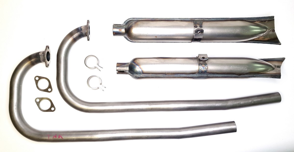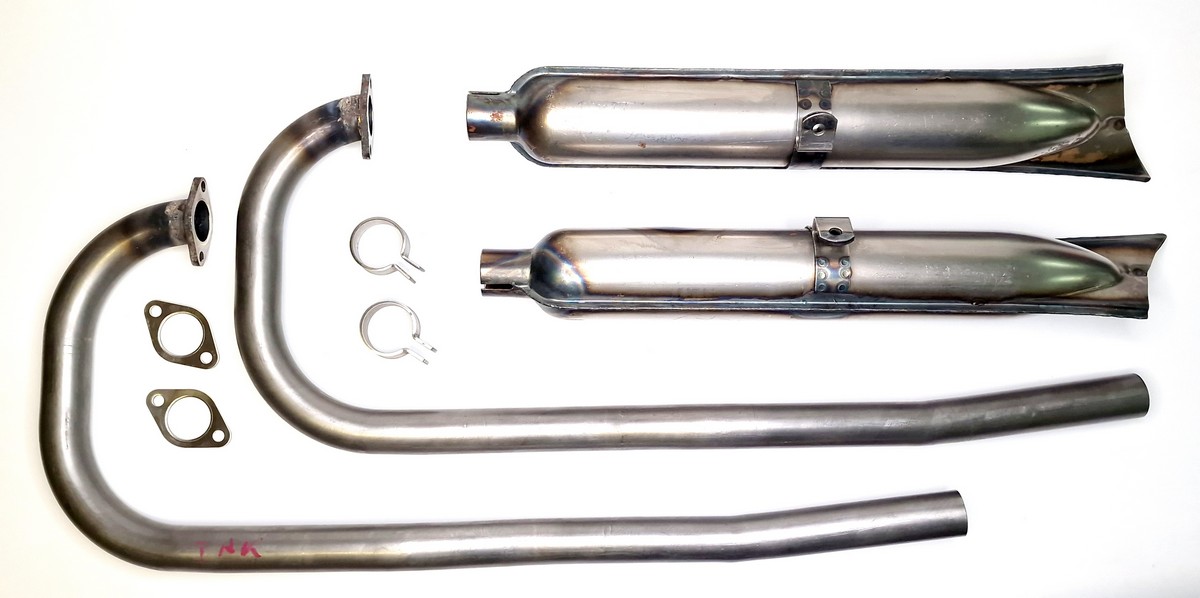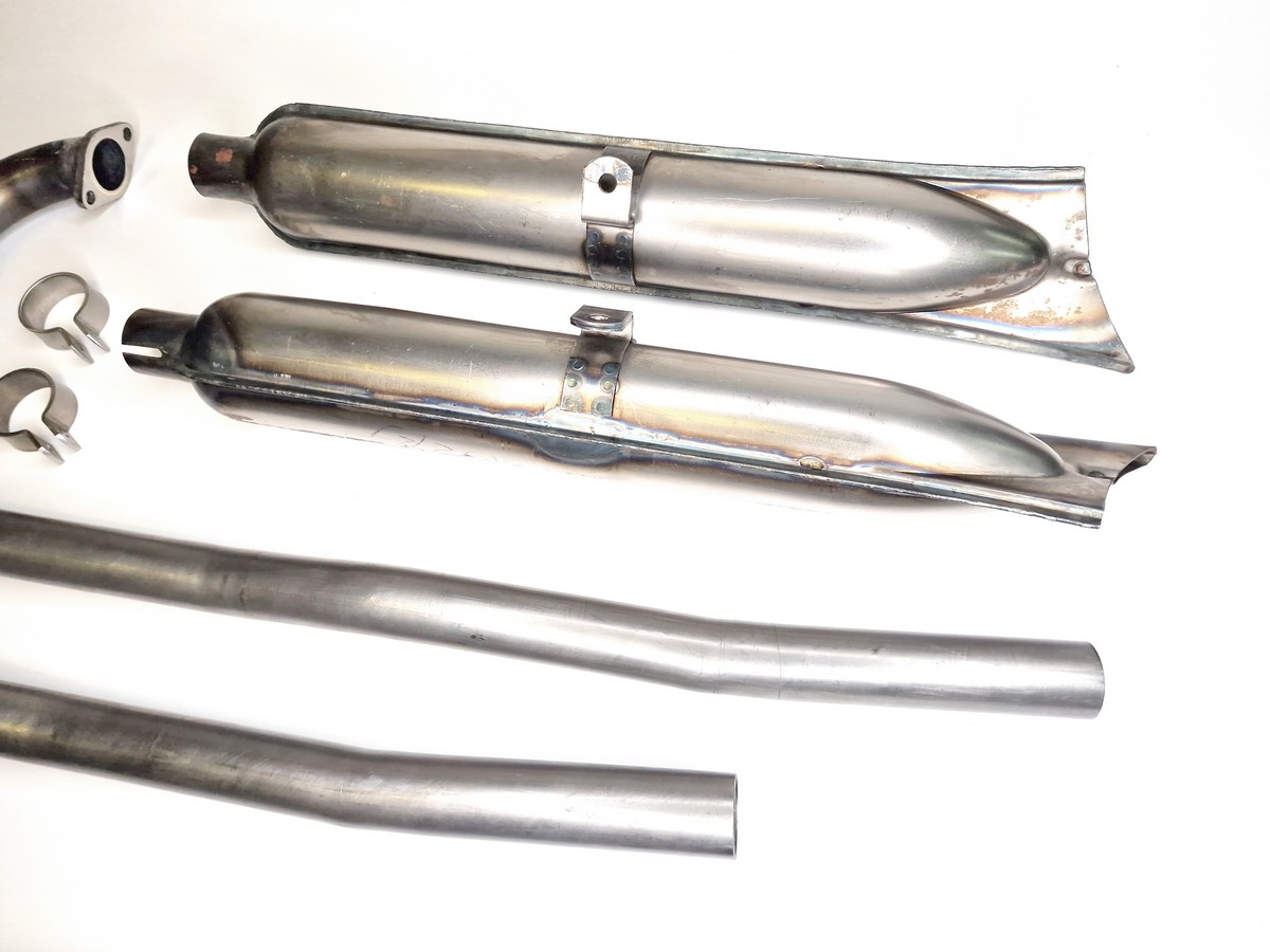 Komplette Auspuffanlage BMW R12 roh ohne D.R.P.; Stahlrohr- und Stahlblech-Nachbau im Rohzustand mit Krümmern, Töpfen, Schellen und Dichtungen; Lieferung: 8-teiliges Set.