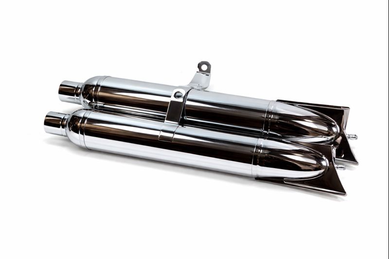 Verchromte Auspufftöpfe links und rechts mit integriertem Schalldämpfereinsatz für DKW 350 NZ und DKW 350 SB Motorräder – Typ LEISTRITZ (Fischschwanz mit Rand).
